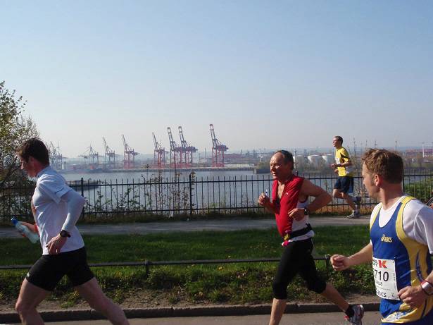 Vorsetzen 9.57 Uhr / Kilometer 11,5 Wäre die Flutschutzwand nicht so hoch. hätte man hier einen tollen Blick in den Hafen. So lief man "nur" als langer Bandwurm auf der tiefer liegenden Straße. |