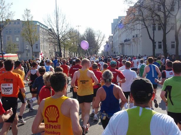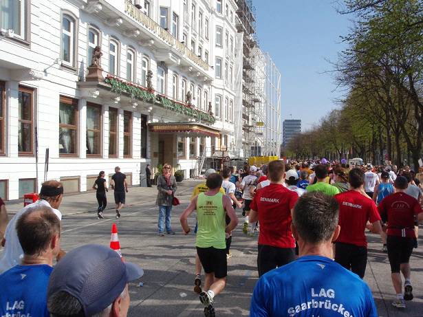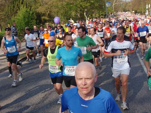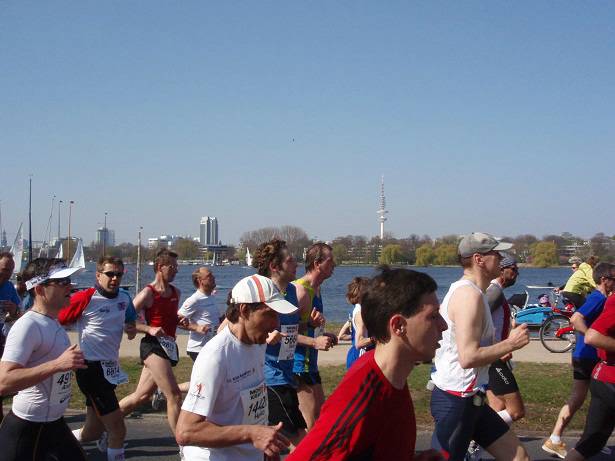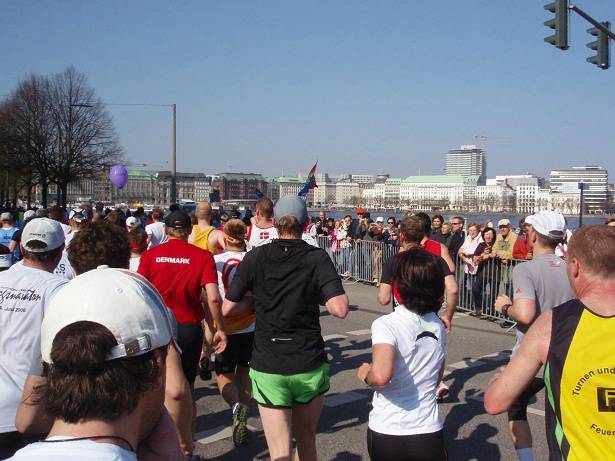 An der Alster 10.21 Uhr / Kilometer 16,0 Nun wurde es etwas schwerer mit dem Laufen, denn die Ballon-Läufer hatte natürlich nicht auf mich gewartet. So 100 Meter zurück gab es kein homogenes Lauffeld mehr, sondern auch viele, die überholt wurden oder gerade den Kontakt zur Gruppe abreißen ließen. An die durfte ich mich nun nicht halten, ich mußte wieder nach vorne. |