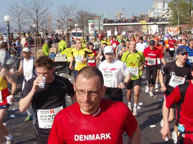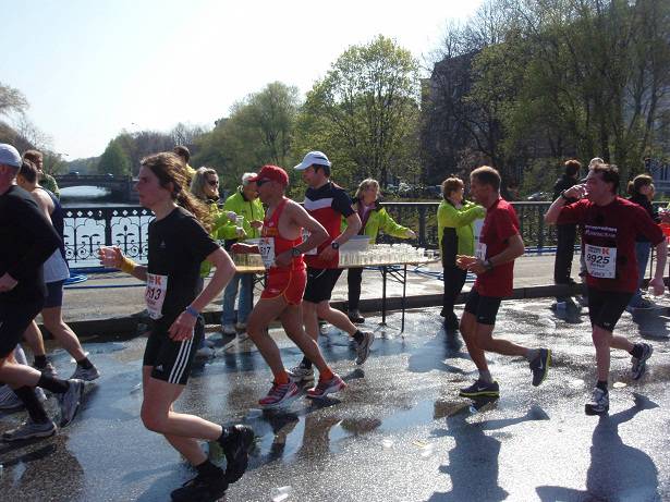 Schwanenwikbrücke 10.28 Uhr / Kilometer 17,5 Der nächste Verpflegungs-stand. Mal ein Tipp an alle Läufer: Die Stände sind alle mehr als 50 Meter lang und auch ganz am Ende gibt es noch Wasser. Es gibt also keinen Grund, daß alle Läufer auf den ersten Tisch zustürzen. Wobei... mir soll e egal sein, dann habe ich am Ende mehr Platz. :-) |