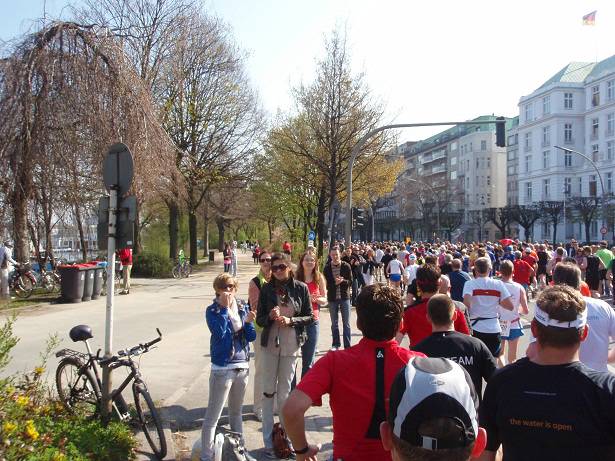 Jungfernstieg 10.14 Uhr / Kilometer 15,0 Hier wurde es wieder voll und laut. Bei dem tollen Wetter standen die Leute natürlich gerne an der Strecke. |