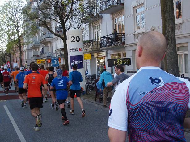 Beethovenstraße 10.38 Uhr / Kilometer 20,0 20 Kilometer nach 1:37:23 Stunden. Die letzten fünf Kilometer in 24:11 Minuten. das lief alles ganz prima nach Plan, auch wenn ich nun etwas schneller unterwegs war als geplant. |