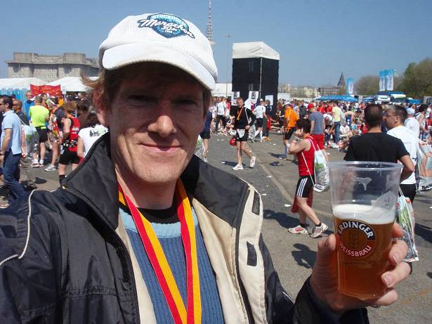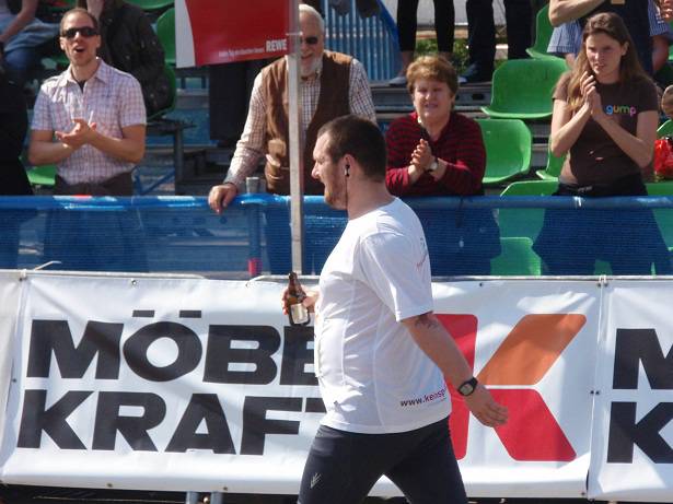 Glacischaussee, 15.11 Uhr Dies sind Prof. Dr. Heiko Reh und seine Bierflasche kurz vor dem Ziel. 6:01:45 Stunden. |