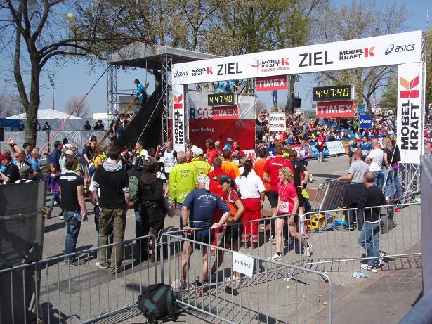 Glacischaussee, 13.47 Uhr Noch immer strömten die Finisher ins Ziel. Es ist ja ein schon länger anhaltender Trend, daß die Finisher-Zeiten bei Marathons im Schnitt immer langsamer werden, also immer mehr Läufer erst ab 4:30 Stunden ins Ziel kommen. Die tolle Leistung ist aber auch bei diesen Läufern unbestritten. |