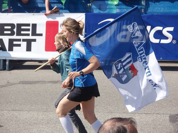 Glacischaussee, 14.06 Uhr Mit Begleitung und Vereins-fahne. Kristin Silke aus Angern, 4:58:09 Stunden.