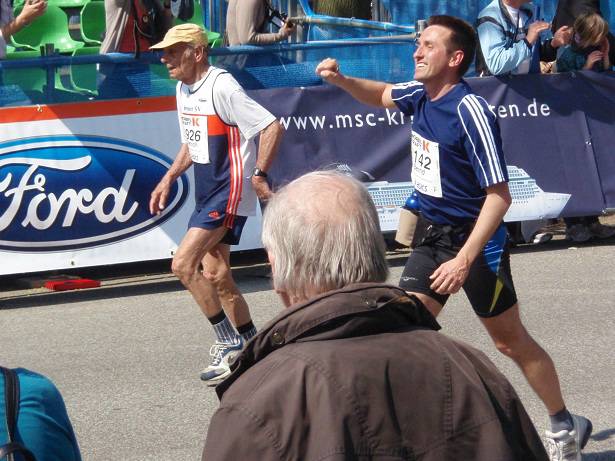 Glacischaussee, 14.17 Uhr Startnummer 1926, Dietrich Hohmann, Jahrgang 1926. 5:10:31 Stunden. Davor schon einmal jubelnd ist Bernd Bauer aus Diedorf. 5:07:38 Stunden. |