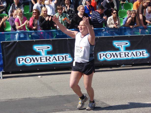 Glacischaussee, 14.02 Uhr Ein Tänzchen auf den letzten Metern. Zbigniew Szkularek aus Polen, 4:53:51 Stunden. |