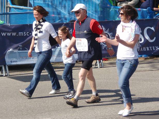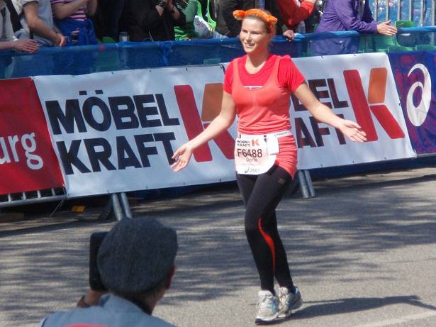 Glacischaussee, 14.22 Uhr So einen Zieleinlauf kann man auch richtig zelebrieren. Guenter Ludwig, 5:16:40 Stunden. |