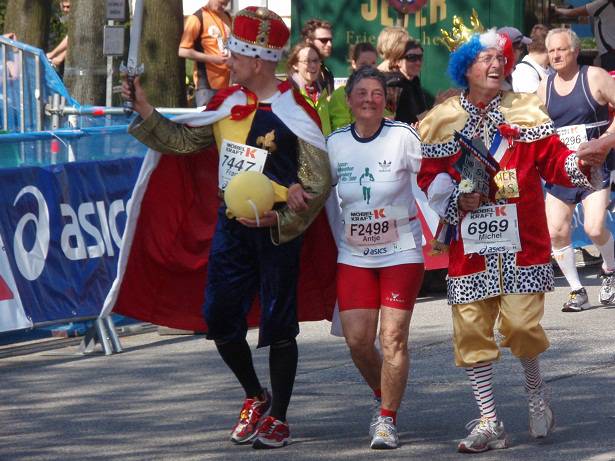 Glacischaussee, 15.24 Uhr Antje Dehnel mit 6:18:29 Stunden als letzte gewertete Läuferin im Ziel. Und das mit prominenter Begleitung. Der König von Wedel, Frank Ebert (links) und mit der Nr. 6969 Michel Descombes. |