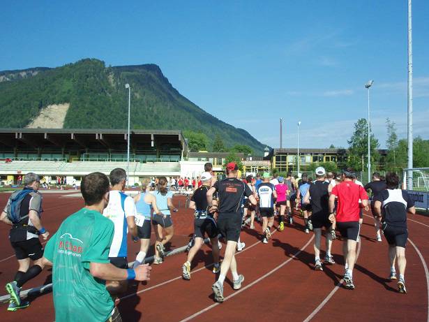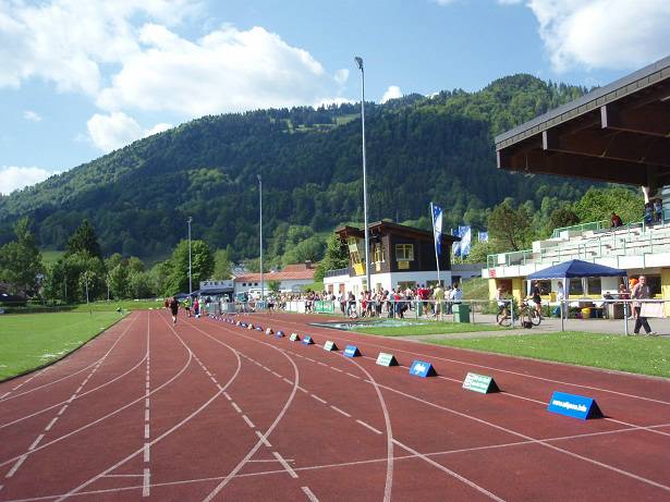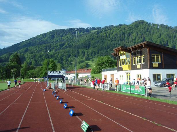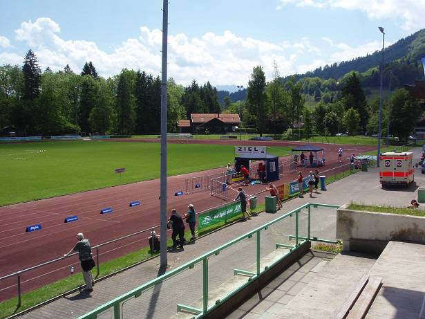 Sonthofen, Illerstadion 10.49 Uhr / Kilometer 30,0 51:30 Minuten für die dritten zehn Kilometer. Ich hielt den angepeilten Schnitte prima ein. 5:09 Min/Km. Der Kurs hier war auch sehr flach. Abgesehen von ein paar Brückenunterführungen ging es ab Immenstadt auf 10,5 Kilometern langsam 30 Höhenmeter rauf. |