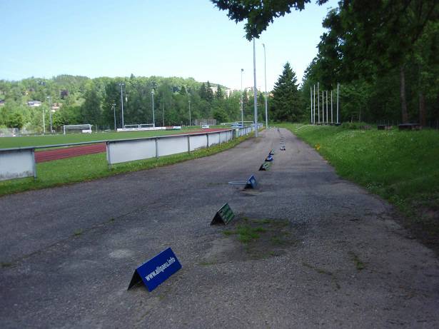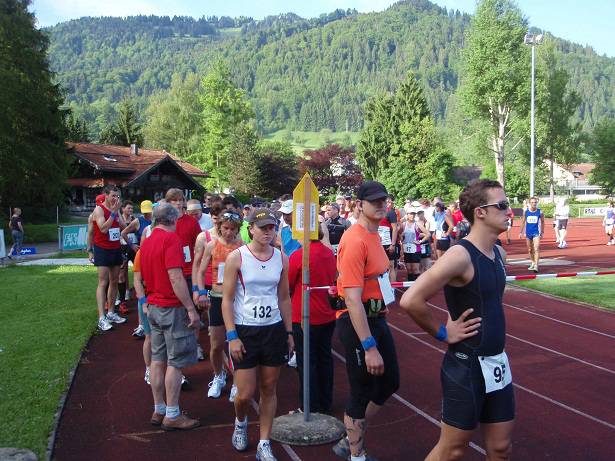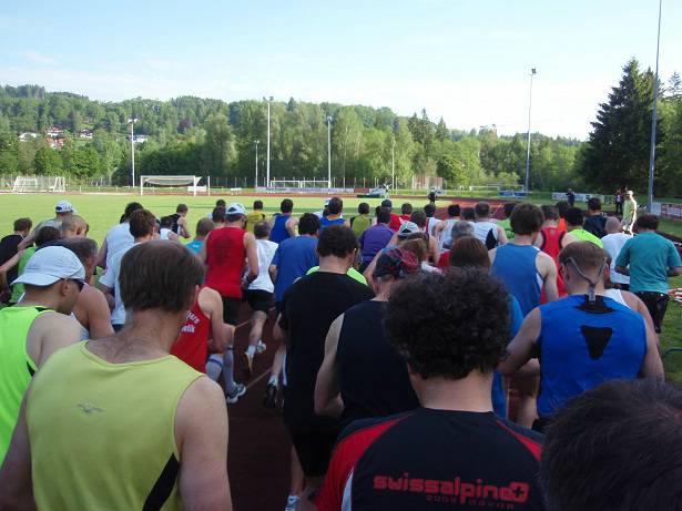 Auwaldstadion, 7.57 Uhr Da konnte man schon einmal einen Blick auf das Ziel werfen. Und sich an die Temperaturen gewöhnen. Mit 18°C war es noch recht angenehm. |