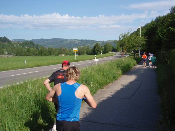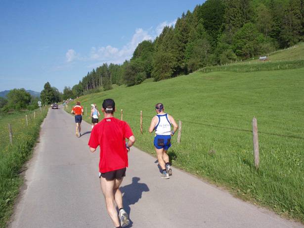 Alpseewies 8.45 Uhr / Kilometer 6,0 Es war ein schönes Laufen, zumal das Wetter mitspielte. Den langsam steigenden Temperaturen stand ein leicht frischer Wind entgegen und nur wenn der mal nachließ, stand man plötzlich in stehender Hitze. |