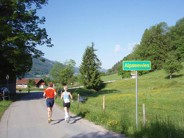 Alpseewies 8.45 Uhr / Kilometer 6,0 Und immer wieder die schöne Sicht auf die Berghänge rechts und den Großen Alpsee links. Da vergißt man die Kilometer und läuft einfach frei auf. |