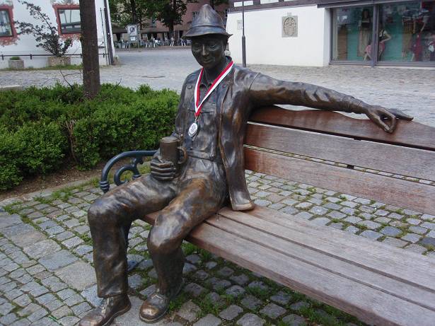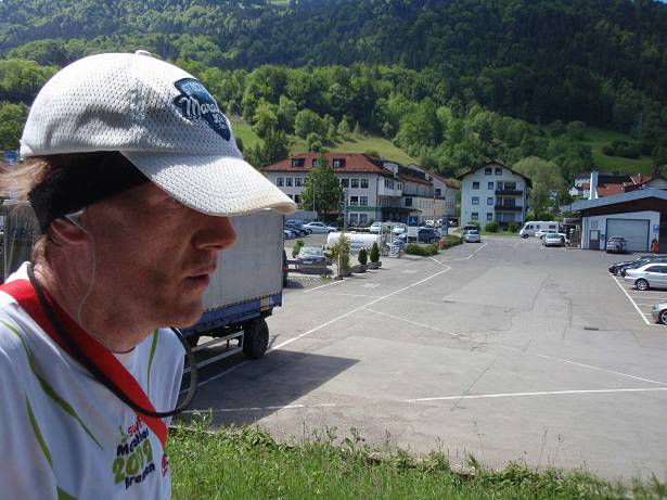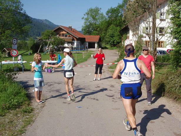 Sonthofen 11.10 Uhr / Kilometer 34,0 Mit dem Vorbeilaufen an den Verpflegungsstände war es längst vorbei. An jedem der ca. alle drei Kilometer aufgebauten Ständen gab es eine Pause. Ein Becher Coca-Cola, ein Becher Iso für den Hals und ein Becher Wasser halb für den Hals und halb zur Kühlung waren Minimum. |