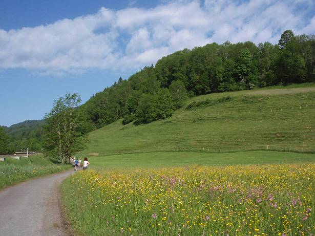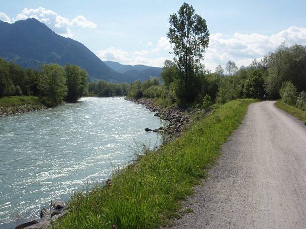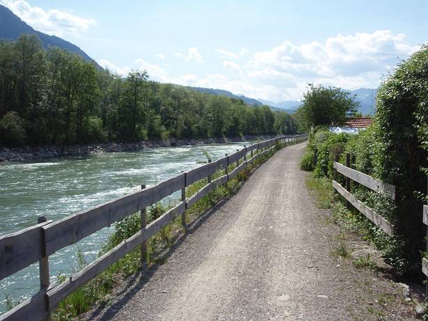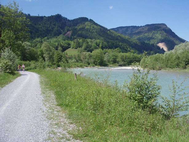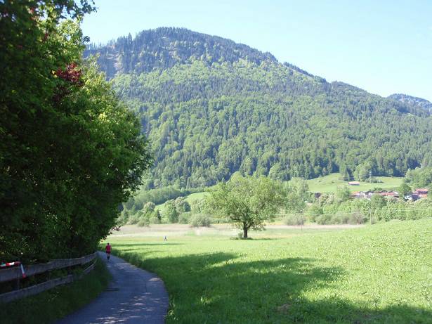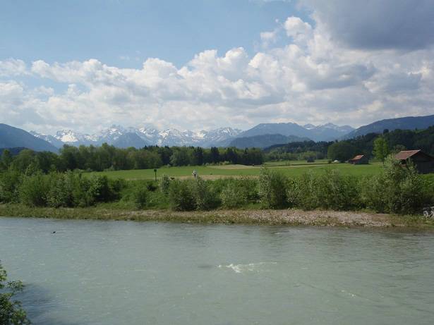 Illeruferweg 11.45 Uhr / Kilometer 41,0 Noch ein letzter Blick auf die Iller und gleichzeitig konnte man sich schon auf das Ziel freuen. Der Berg rechts liegt bereits hinter Immenstadt. |