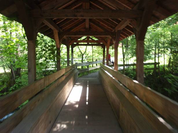 Brücke Konstanzer Ach 9.56 Uhr / Kilometer 19,5 In Immenstadt ging der Kurs nicht wieder durch die Innen-stadt, sondern nun verkehrs-schonend nördlich davon. Da kommt man dann auch über solche schmalen Brücken. Der Radfahrer auf der anderen Seite war so nett zu warten. Überhaupt... nette Radfahrer. Ein echter Kulturschock. Aber ein sehr angenehmer. |