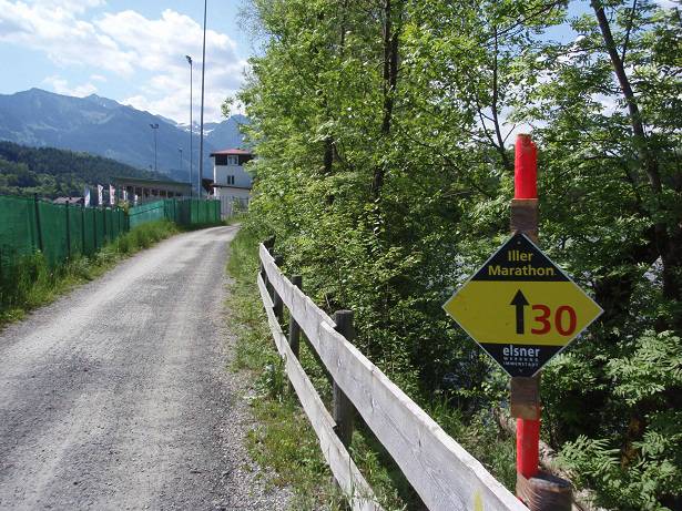 Illeruferweg 10.17 Uhr / Kilometer 24,0 Nach einer halben Runde im Stadion ging es an den dem Marathon den Namen gebenden Fluß Iller. Statt Asphalt lief man nun meist auf Wanderwegen mit leichtem Kiesel. Das war etwas schwieriger als zuvor, war aber machbar. |