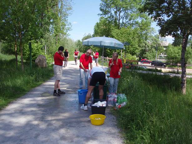 Trieblings 8.55 Uhr / Kilometer 7,5 Eine der Verpflegungsstellen. Am Anfang gab es "nur" Wasser und Iso, ab Km 15 dann auch Bananen und später auch Coca-Cola und andere Leckereien. Wegen des warmen Wetters gab es auch ein paar mehr Stellen als sonst. |