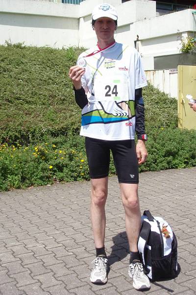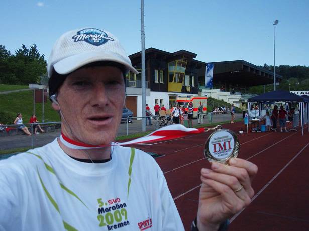 Auwaldstadion 11.53 Uhr / Kilometer 42,15 Und Schlußspurt ins Ziel. Zu einer Zeit 3:27:xx Stunden reichte es dann nicht mehr, aber das war dann auch noch egal. Hauptsache Ziel. Ein paar Zuschauer hatten sich auch eingefunden, aber es war doch insgesamt sehr ruhig. Im Ziel tauschte man dann das Rote (Band), das Schwarze (Band) und das Blaue (Zeitchip) gegen das Silberne (Medaille) ein. |