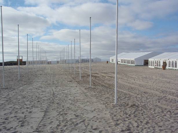 Am Folgetag war hier mehr los und geflaggt war auch. Aber man konnte schon einmal in aller Ruhe den Zieleinlauf im tiefen Sand üben. |