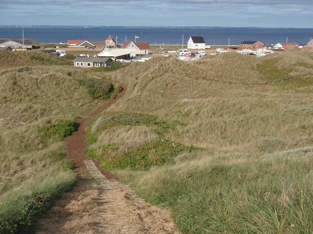 Dünenlandschaft bei Årgab Camping In Deutschland waren es den Tag 28°C und für den Lauf-sonntag sollte es ähnlich werden. Für West-Dänemark waren zum Glück nur bis 22°C und leichter Wind aus West oder Nord-West angekündigt. Bei einem Lauf ständig nach Norden an der offenen See ist die Wind-richtung schon wichtig. |