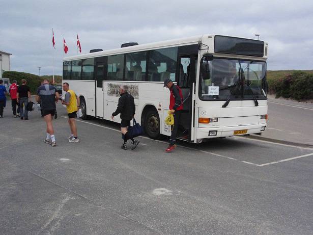 In Hvide Sande war einer der Sammelpunkte für den Bus-Transport zum Start am Vejers Strand. Abfahrt war pünktlich um 8.15 Uhr. Und man sollte die ausgedruckte Teilnahmebestätigung mit der gebuchten Bus-Transfer dabei haben, sonst wird es ggf. nichts mit der Mitnahme. |