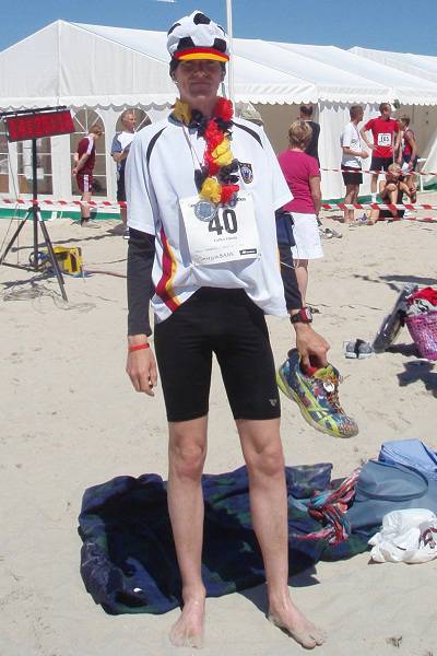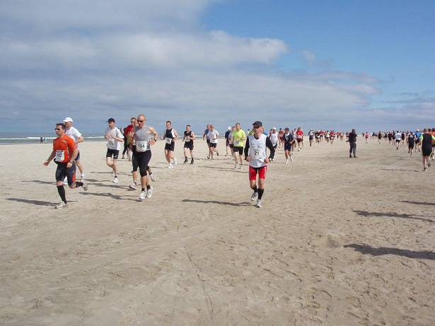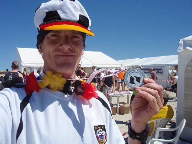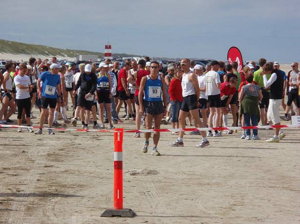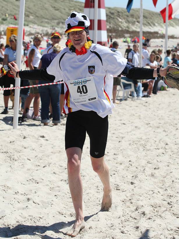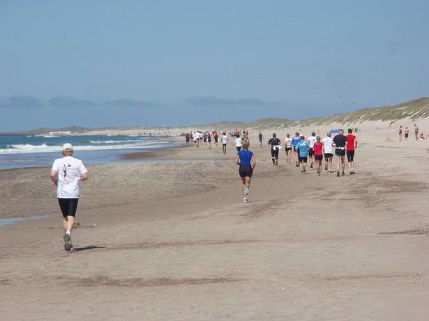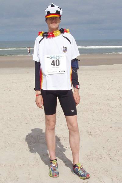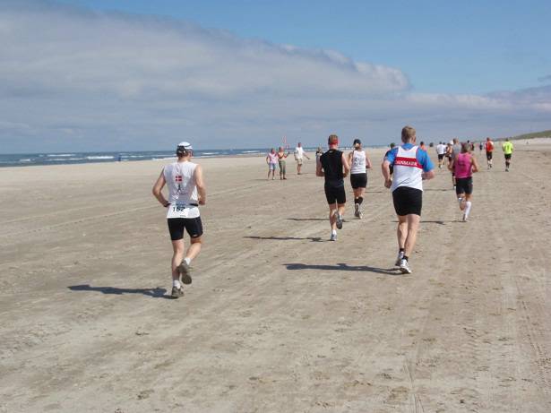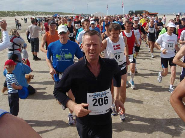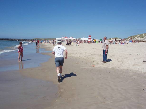 Vejers Strand, 10.21 Uhr 186 Läuferinnen und Läufer hatten sich versammelt. Einige waren wie für einen Lauf durch die Sahara angezogen, einige liefen barfuß. Aber so bekloppt mit Fußballhut und Deutschland-Trikot lief wieder einmal nur ich. |
