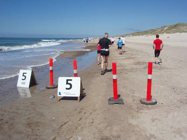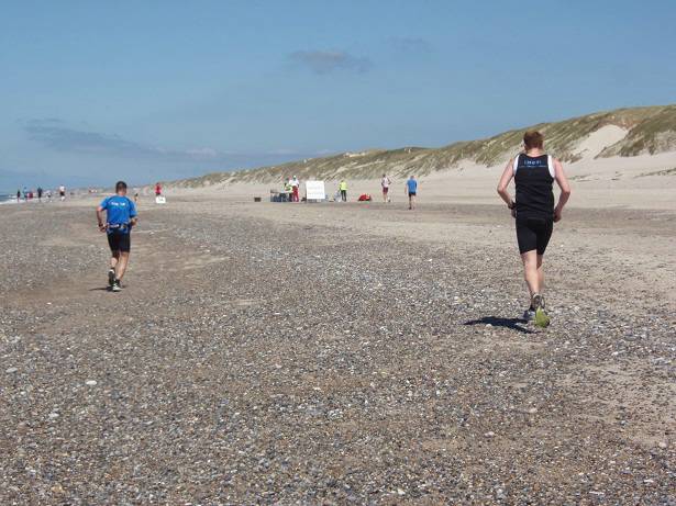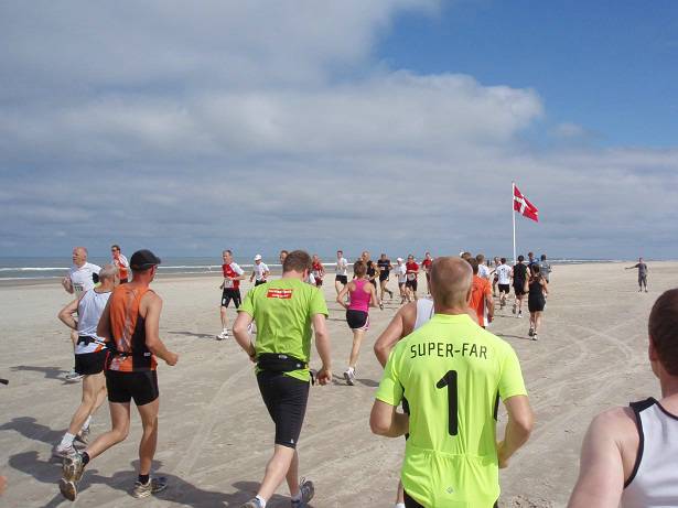 Årgab Strand Kilometer 37,2 / 13.50 Uhr Hier die Wende des 10-Km-Laufes, der um 12.30 Uhr in Hvide Sande gestartet wurde. Das bedeutete: noch mehr Läufer, die bereits vor mir den Sand durchwühlt hatten. |