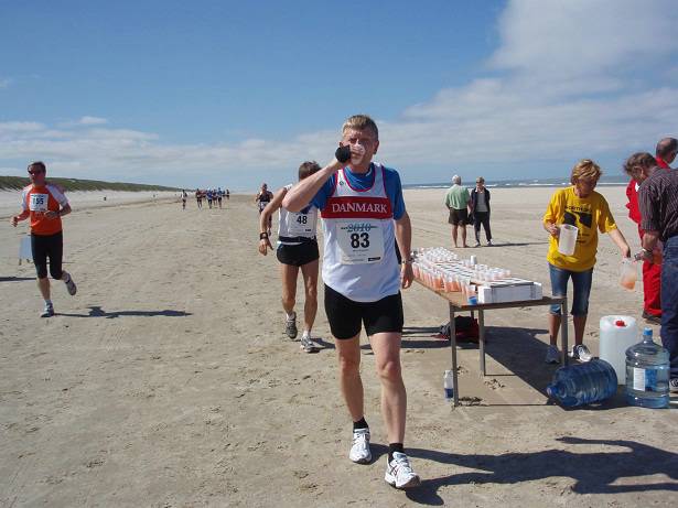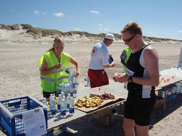 Årgab Strand Kilometer 40,2 / 14.07 Uhr Ein allerletzter Verpflegungs-stand kurz vor dem Ziel. Netterweise brachte man uns hier das Wasser runter an die besser zu laufende Stelle. |