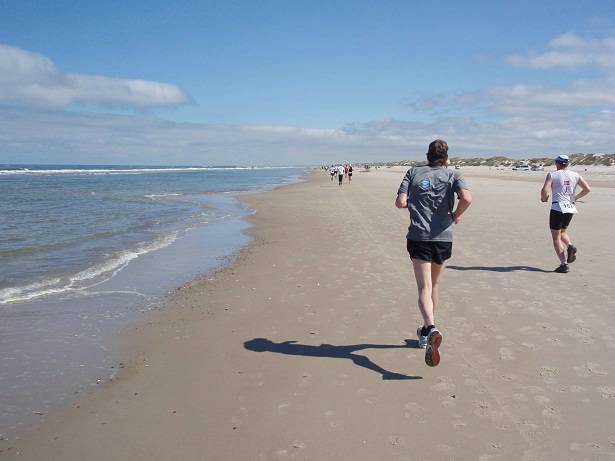 Gammelgab Kilometer 20,0 / 12.09 Uhr Ein wenig weicher wurde der Strand schon. Aber es ließ sich weiter gut laufen. Das Wetter war auch klasse. Um die 22°C, Sonne (sieht man ja) und ein leichter bis frischer Wind von schräg vorne. |