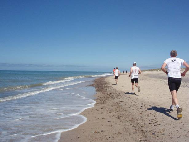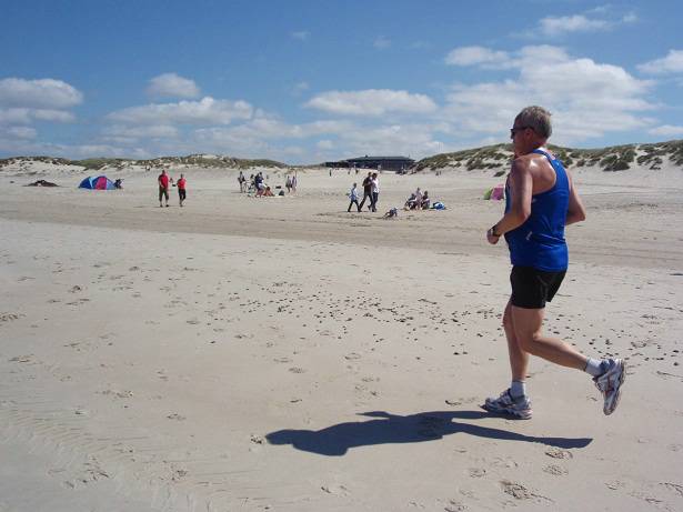 Nymindegab Kilometer 22,0 / 12.25 Uhr Nun begann meine Zeit des Überholens. Langsam und allmählich "sammelte" ich alle wieder ein, die am Anfang so enthusiastisch davon gestürmt waren. Ok, es ist nicht mein Laufziel, Läufer zu überholen, es ergibt sich aber aus meinem eher gleichmäßigem Tempo von alleine. |