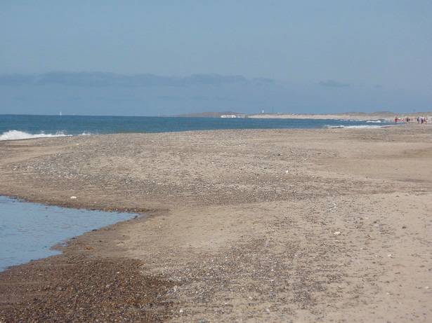 Sønder Haurvig Kilometer 33,0 / 13.25 Uhr Da in der Mitte des Bildes, der breite weiße Strich. Das ist das Ziel Hvide Sande. Sind nur noch 9,2 Kilometer Sand bis dahin. |