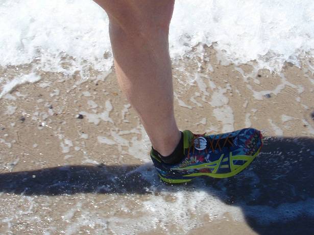 Sønder Haurvig Kilometer 36,0 / 13.42 Uhr Ich hatte allerdings auch extra die leichten TRI-NOOSA von ASICS dabei. Die werden im Wasser nicht so schwer und trocken sehr schnell. |