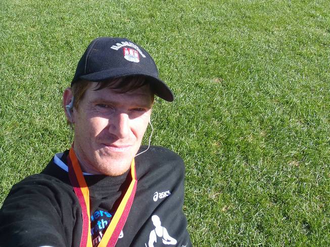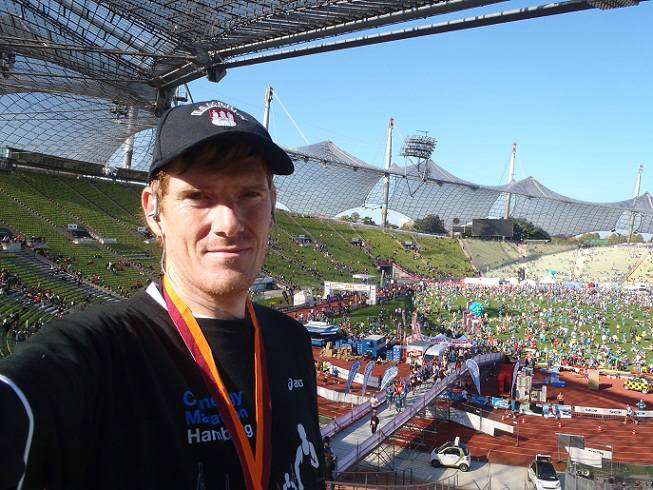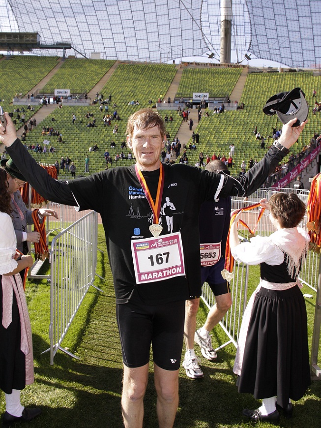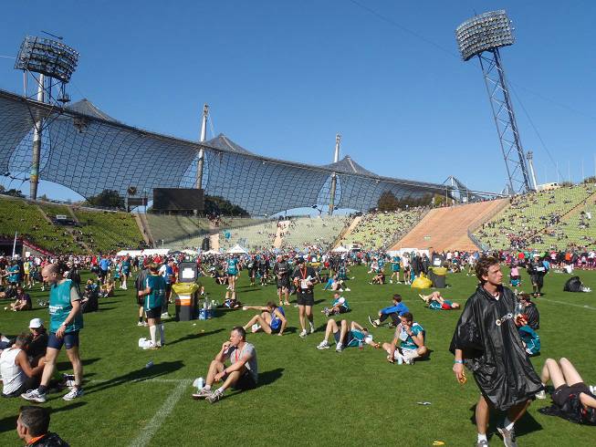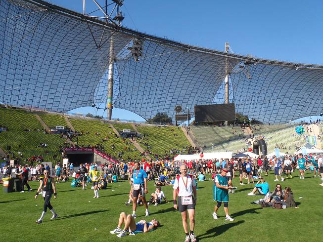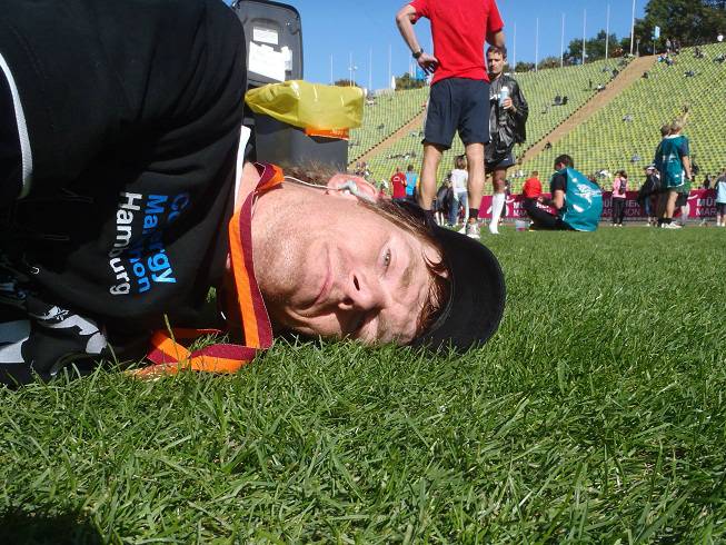 Olympiastadion München ... aber die blöde Rippe tat nun noch viel mehr weh als vor dem Rennen und liegen auf dem recht harten Boden ging daher nur sehr kurz. Ich wollte eh hoch und mich bei dem einem 3:45-Ballon-Läufer für die schöne Jagd durch München bedanken. Zu meiner Überraschung kam er aus Kiel. Wie weit man doch reisen muß, um seine Nachbarn zu treffen. |