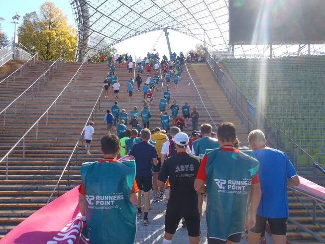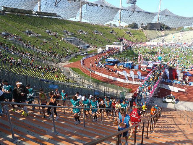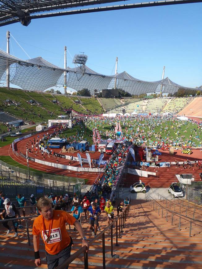 Olympiastadion München Der Aufstieg hier war nach dem Marathon nicht so leicht. Ich kam noch ganz gut rauf, mit nur leichtem Torkeln. Einige andere Läufer wurden hier heraufgetragen oder schafften den Weg mühevoll mit zwischenzeitlichen Pausen in mehreren Etappen. |