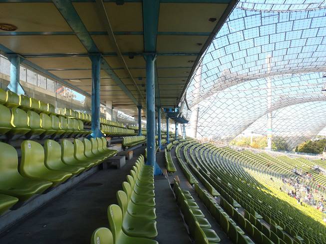 Olympiastadion München Der Ausgang führte über eine Brücke (schön viele Stufen rauf) und dann noch hier die große Tribüne hoch. |