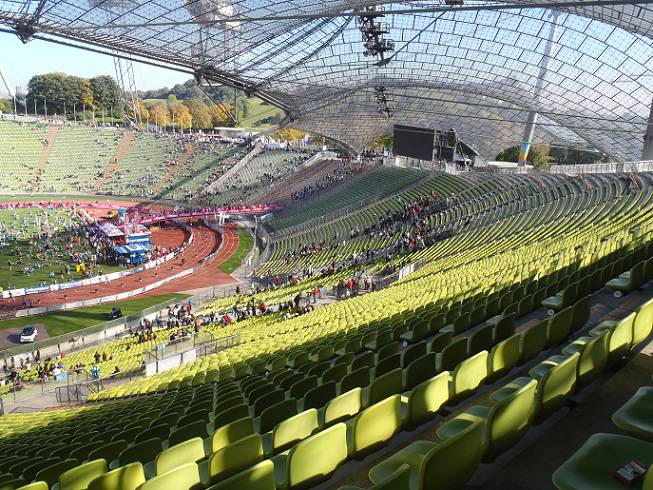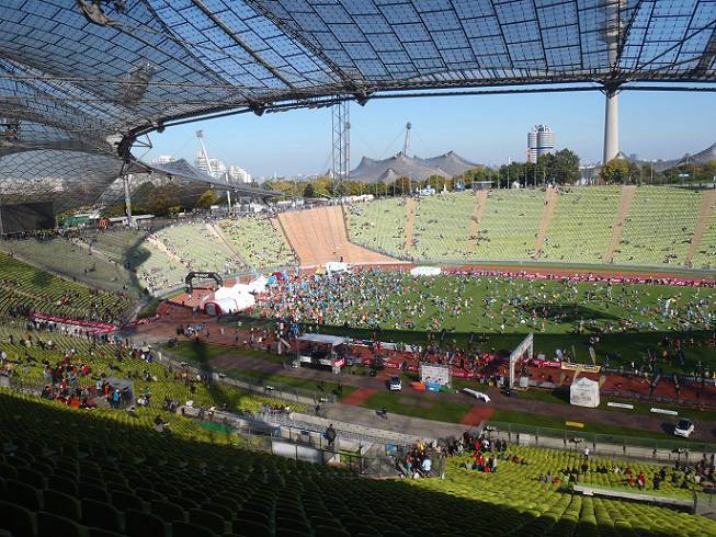 Olympiastadion München Die Tribünen war auch recht gut besetzt. So einige Tausend Zuschauer mögen es wohl gewesen sein. Darunter aber sicher auch viele Läufer. Neben dem Marathon gab es unter anderem auch noch einen Halbmarathon und einen 10-Km-Lauf, die beide schon beendet waren. |