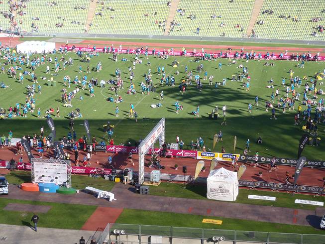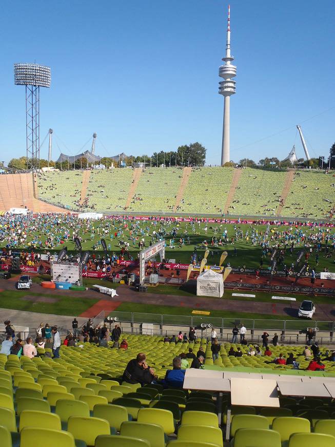 Olympiastadion München Aus der Ferne von den Tribünen des Olympiastadions gesehen sah es so aus wie ein Volksfest. In gewisser Weise war es das auch. In erster Linie waren es aber dann doch "nur" sehr viele sehr müde und sehr glückliche Läufer. |