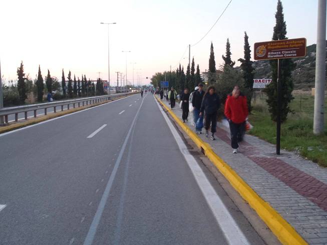 Marathonas, 6.30 Uhr Die Busreise dauerte eine knappe Stunde. Ausreichend für ein kleines mitgebrachtes Frühstück und eine ungefähre Begutachtung der Strecke. nachdem es etwas heller geworden war. Jaja... sah ziemlich hügelig aus. |