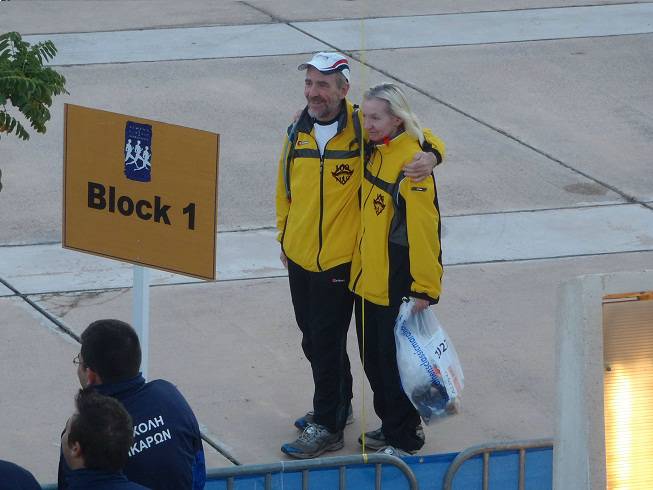 Marathonas, 6.36 Uhr Beliebtes Fotomotiv. :-) In den Ort selbst kamen wir gar nicht hinein. Der Sammel-punkt und auch das Stadion mit dem Marathon-Startplatz liegt etwas abseits. Aber ganz offiziell waren alle Straßen des Ortes zur Aufwärmzone erklärt. Trotzdem blieben die Läufer fast alle in der Nähe des Sammelplatzes. |