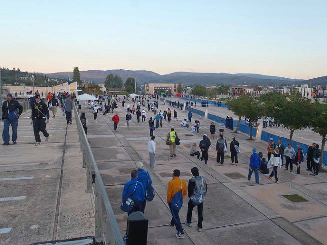 Marathon Stadion, Marathonas, 6.53 Uhr Das Stadion von Marathon war der offizielle Sammelplatz für alle Läufer. Toiletten gab es nördlich des Stadions auf einem Basketballfeld und südlich auf einem großen Parkplatz. Etwas verwirrend war die Anordnung von Rampen und Wegen ins Stadion hinein, zu den Tribünen des Stadions und dem Startbereich. Aber man hatte ja viel Zeit zum Orientieren. |