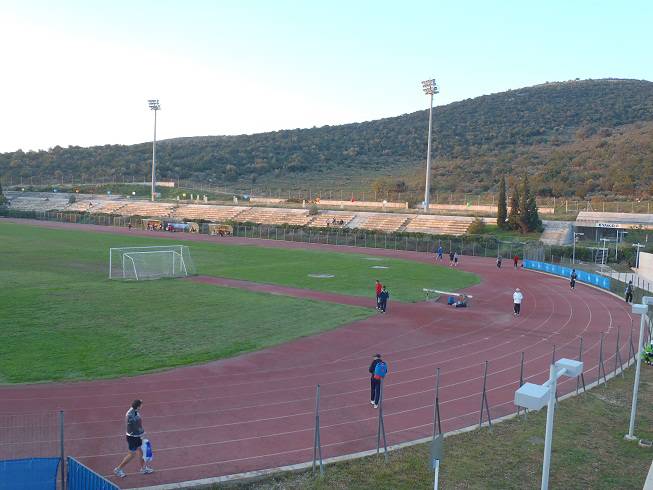 Marathon Stadion, Marathonas, 8.03 Uhr Zwischendurch gab es auch Musik. Entweder die Techno-Fassung des Sirtaki oder Lena Meyer-Landruts "Satellite". Was eine krude Mischung... |