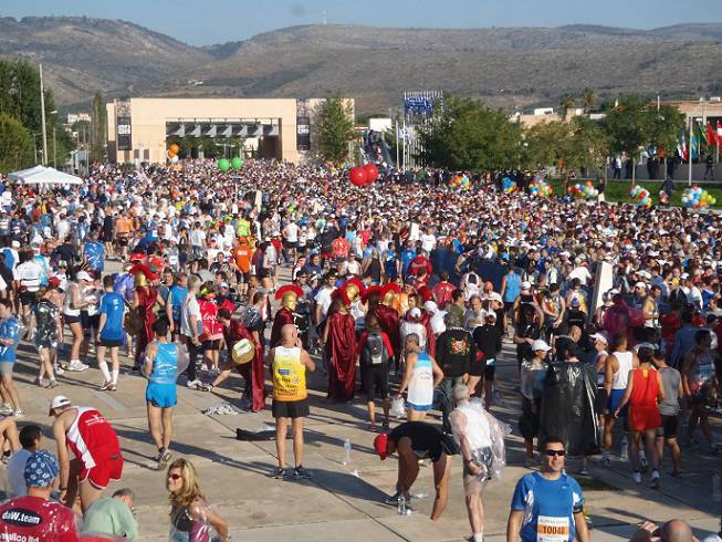 Marathonas, 8.28 Uhr So allmählich wurde es dann aber doch Zeit, in Richtung Start zu gehen. Ein wenig Wühlarbeit stand da noch vor mir. 12500 Teilnehmer hatten sich angemeldet. 10371 davon tauchten in den Ergebnis-Listen später auf. Dann waren wohl rund 11000 Läufer hier am Start. |