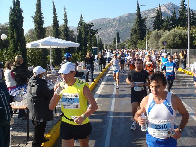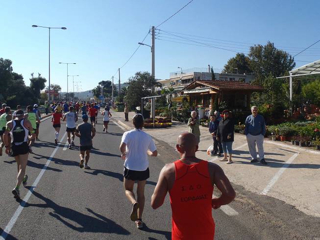 Leoforos Marathonos Nea Makri 9.54 Uhr / Km 10,0 Für so viel Party an der Strecke hatte ich auch die falsche Playlist auf dem mp3-Player. Aber immer noch besser so als anderes herum. |