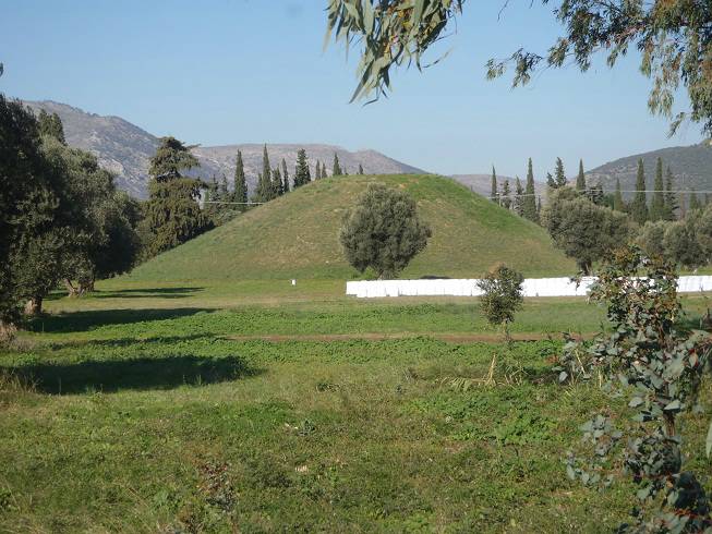Marathonomachon Agios Panteleimonas 9.29 Uhr / Km 5,0 Knapp einen Kilometer lang haben wir ihn umrundet, aber zu sehen bekam man ihn nur kurz an wenigen Stellen: Der Tymvos Marathona, der Grabhügel der 192 in der Schlacht von Marathon 490 v. Chr. gefallenen Athener Soldaten. Seltsamer Weise schaute kaum ein Läufer mal nach rechts. |