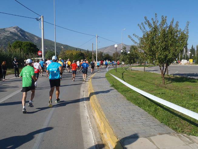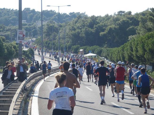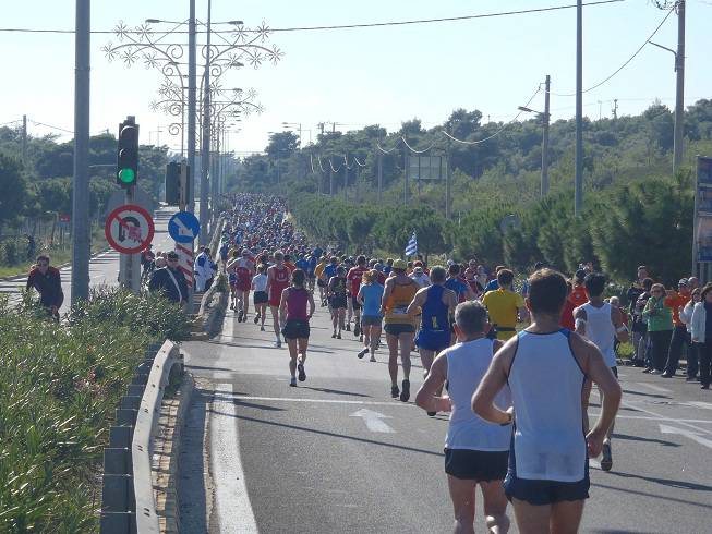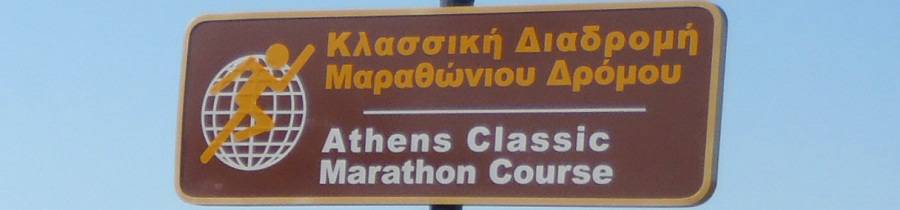 Leoforos Marathonos 9.05 Uhr / Km 0,5 Wenn man vom North Sea Beach Marathon (immer in eine Richtung an der Wasser-linie entlang) mal absieht, ist dieses der Marathon, bei dem man sich am schwersten verlaufen kann. Bis Km 30 ist man praktisch immer auf der Leoforos Marathonos nach Athen unterwegs und auch danach geht es bis Km 40 weiter geradeaus. |