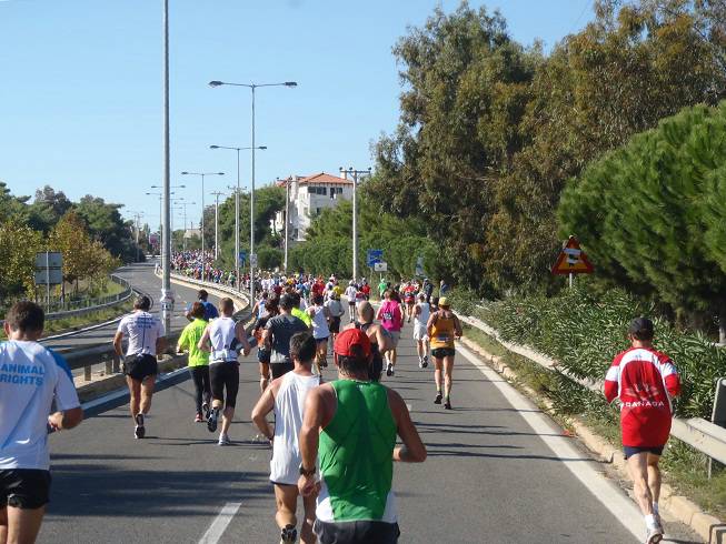 Leoforos Marathonos Vranas 9.18 Uhr / Km 3,0 Nanu? Für einen Marathon, bei dem es nach Aussagen von Startern früherer Jahre praktisch keine Zuschauer geben sollte, standen hier aber doch recht viele am Straßenrand. |