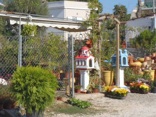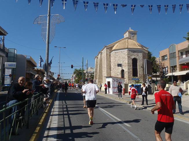 Leoforos Marathonos Kallitechnoupolis 10.36 Uhr / Km 18,0 Diese Mini-Kirchen findet man sehr oft an der Strecke. Sie sollten Glück bringen und Unfälle vermeiden. Falls mal jemand solch eine Kirche mit Blumen dran oder drum herum findet, dann bedeutet es, daß doch ein Unfall passiert ist. |