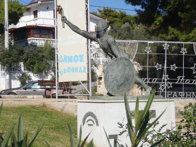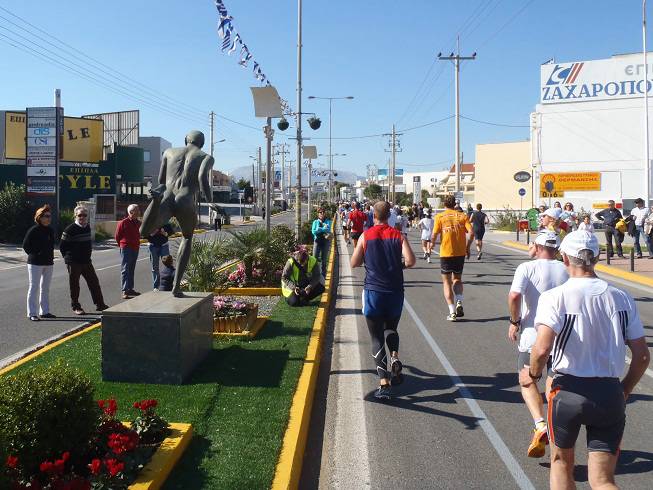 Leoforos Marathonos Kallitechnoupolis 10.38 Uhr / Km 18,0 Noch eine der hübschen Läufer-Statuen entlang der Strecke. Die sollte man alle mal im Streckenplan einzeichnen. |