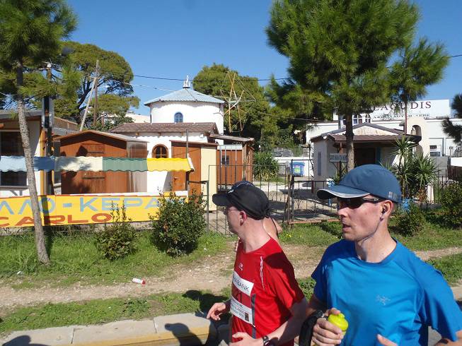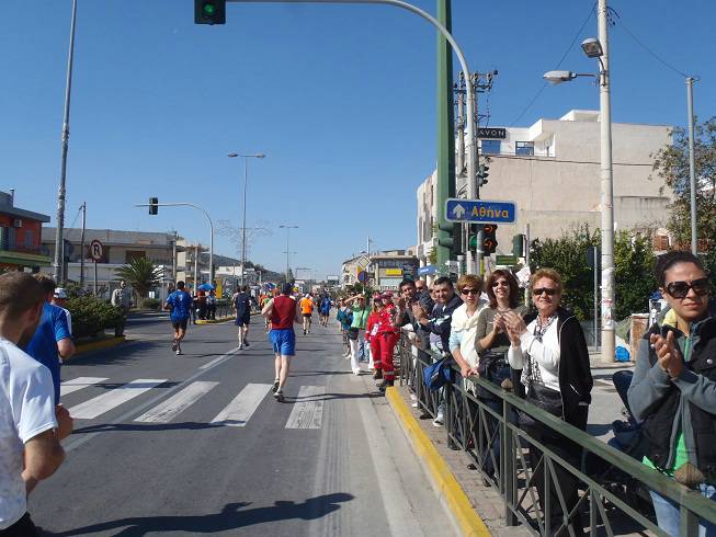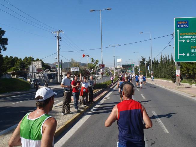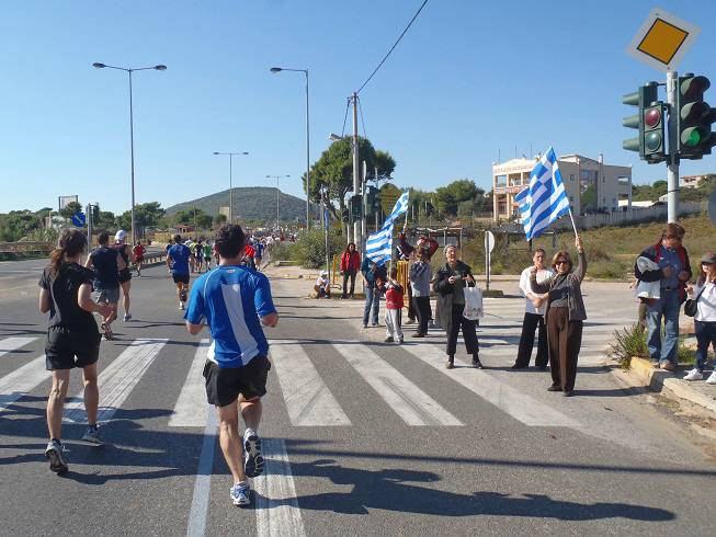 Leoforos Marathonos Aghia Kyriaki 10.41 Uhr / Km 18,5 Ich hätte mir vielleicht auch eine griechische Fahne besorgen sollen. |
