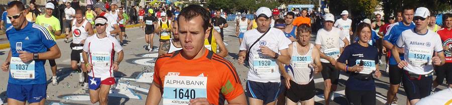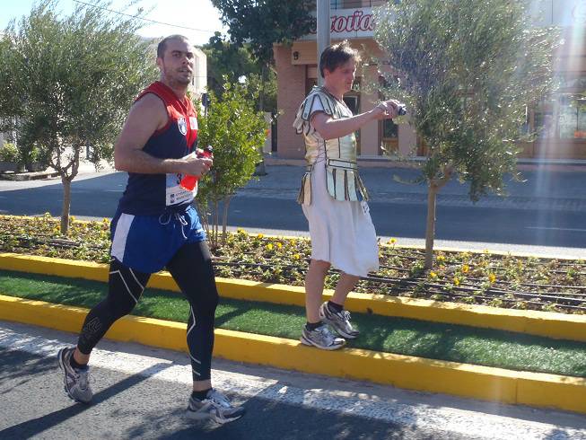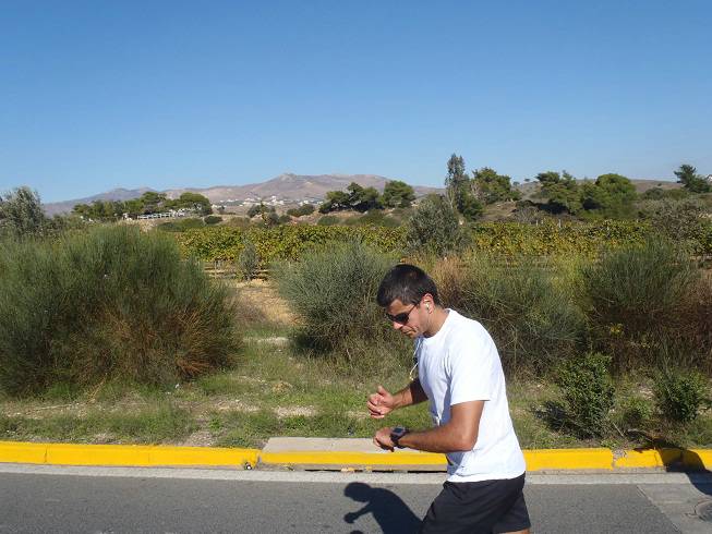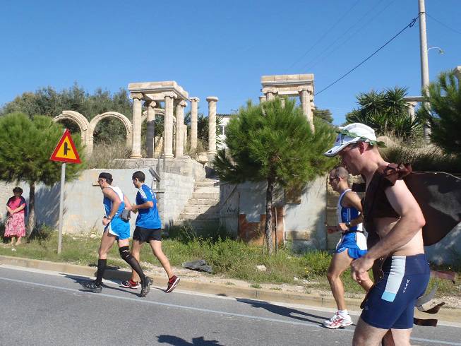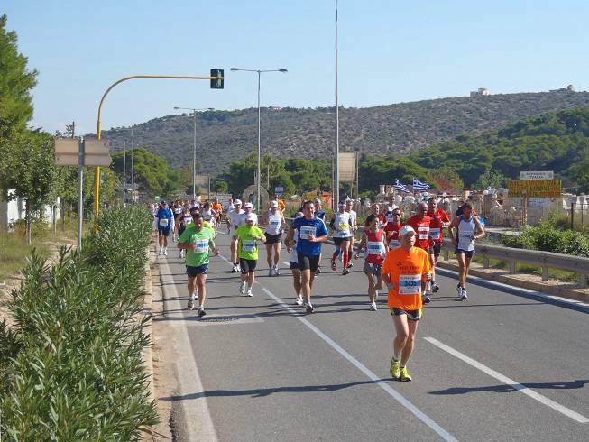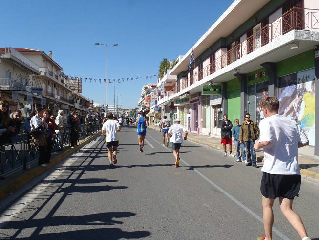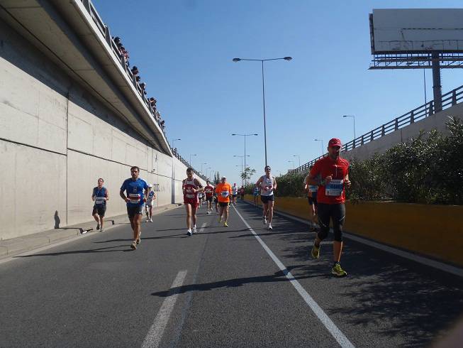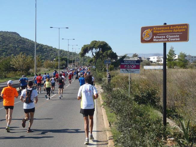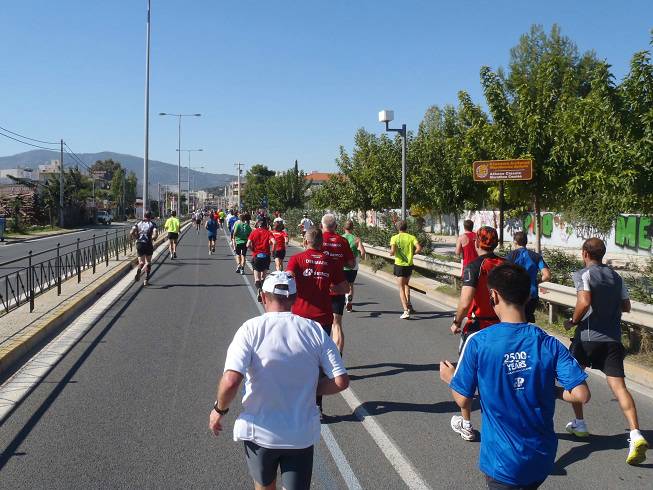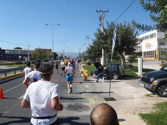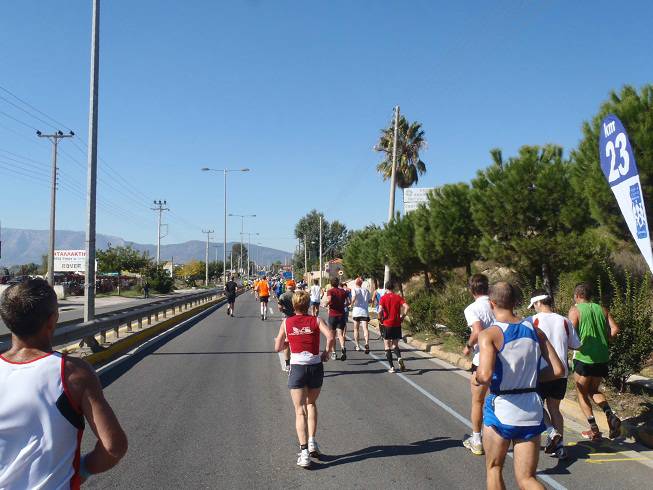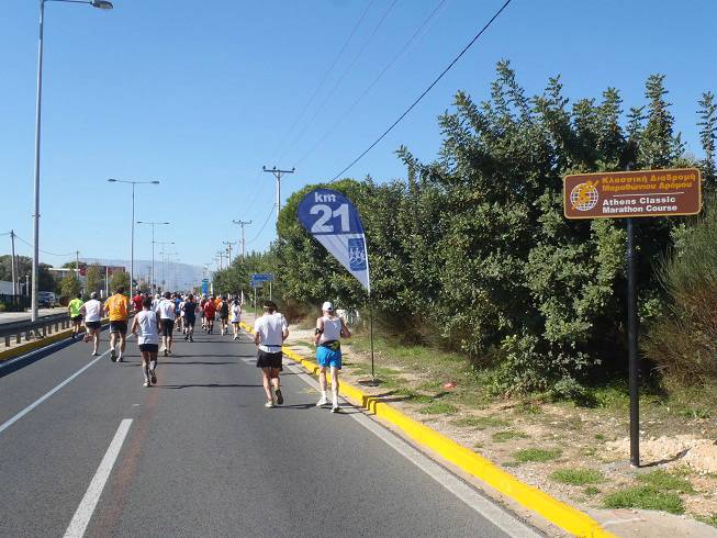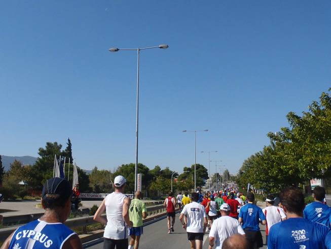 Leoforos Marathonos Pikermi 10.55 Uhr / Km 21,1 Halbmarathon. 1:53:29 Stunden auf der Uhr. Auf der Jagd nach einer Zeit unter 3:45 Stunden war das etwas langsam, aber so lange es mir läuferisch noch gut ging, war das ok. Das Sightseeing der Tage zuvor sollte ja nicht vergessen werden, wenn gleich man die Beine auch nicht wirklich dran erinnern sollte. |